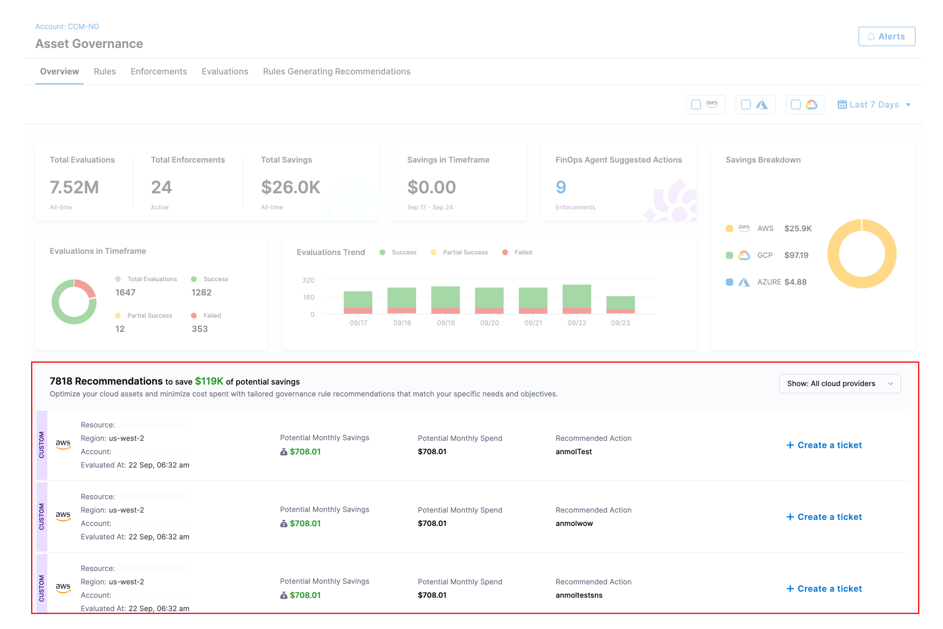 - Alerts : Alerts allow you to receive notifications when certain conditions are met during governance evaluations. These conditions can be fine-tuned based on cloud providers, resource types, account/subscription/project , cost impact, and resource count.