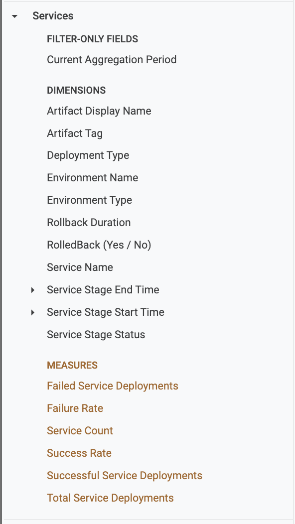 When you select CD-specific fields (for example, from CD Stage Execution Helm Manifest Info, CD Stage Executions, Environments, or Services views), the data displayed will only include CD stage–related executions.