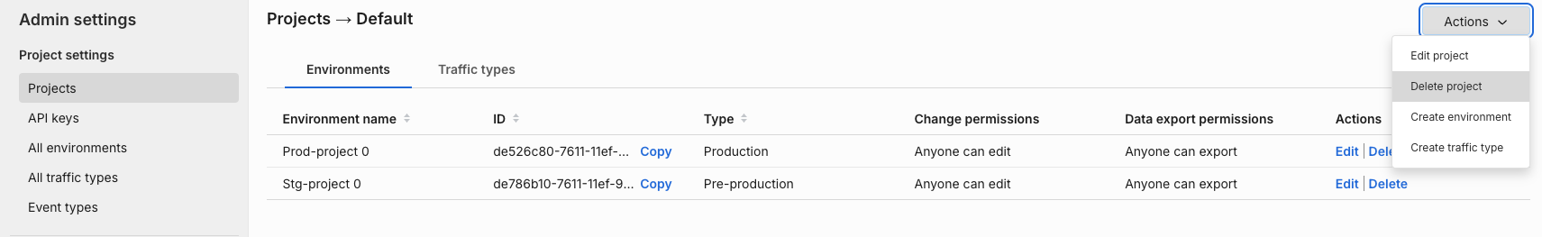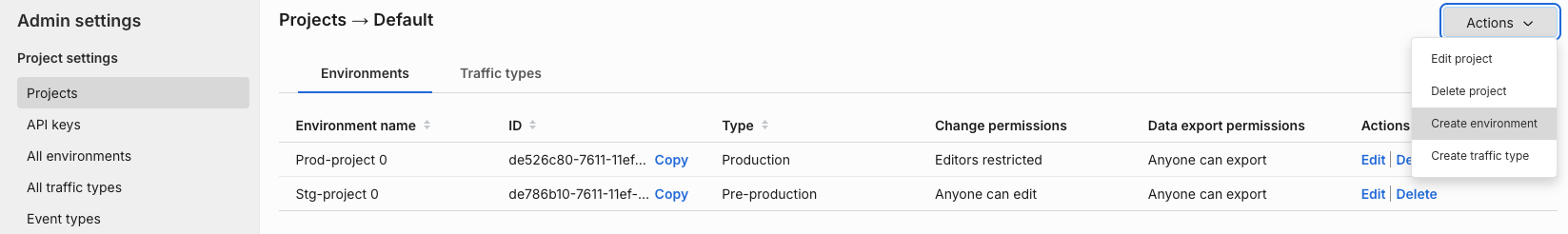 This project has two environments and one traffic type created underneath it. You can rename and edit these environments and traffic types and add more to the Default project.