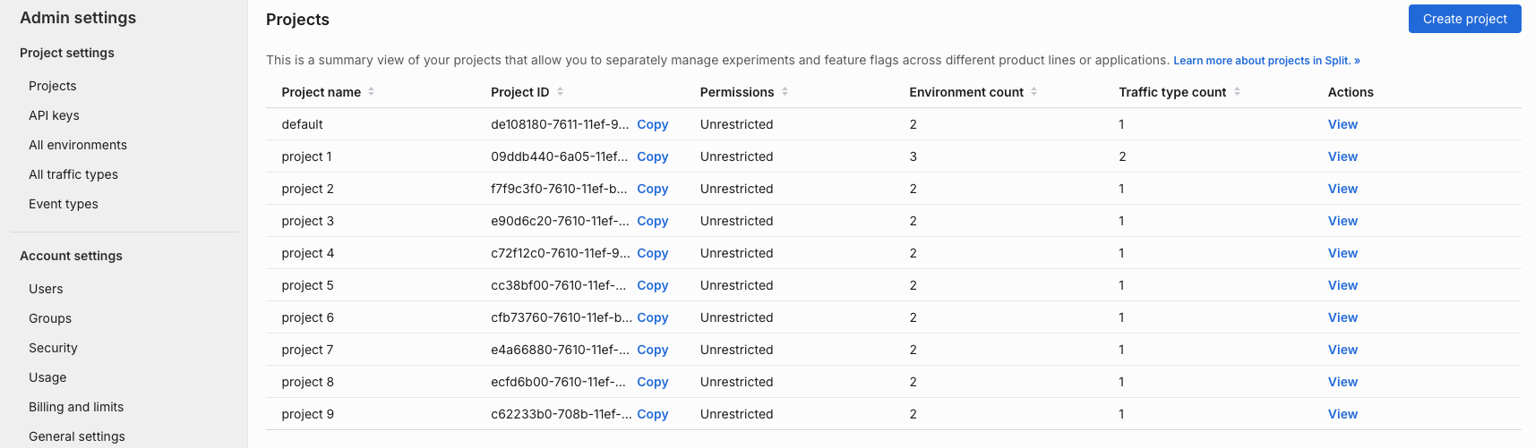 3. Select View on the desired project. From here, you can see the environment name, ID, type of project it is, permissions setting, and data export permission settings.
