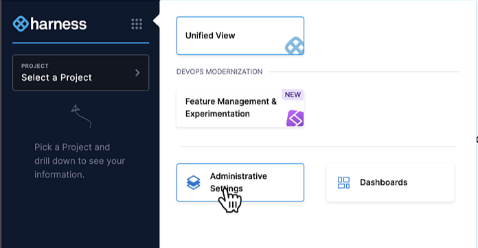 After accepting the invite, your IT colleague should click the nine-box icon to the right of the Harness logo and then click the Administrative Settings button. They should not click the Feature Management & Experimentation button.