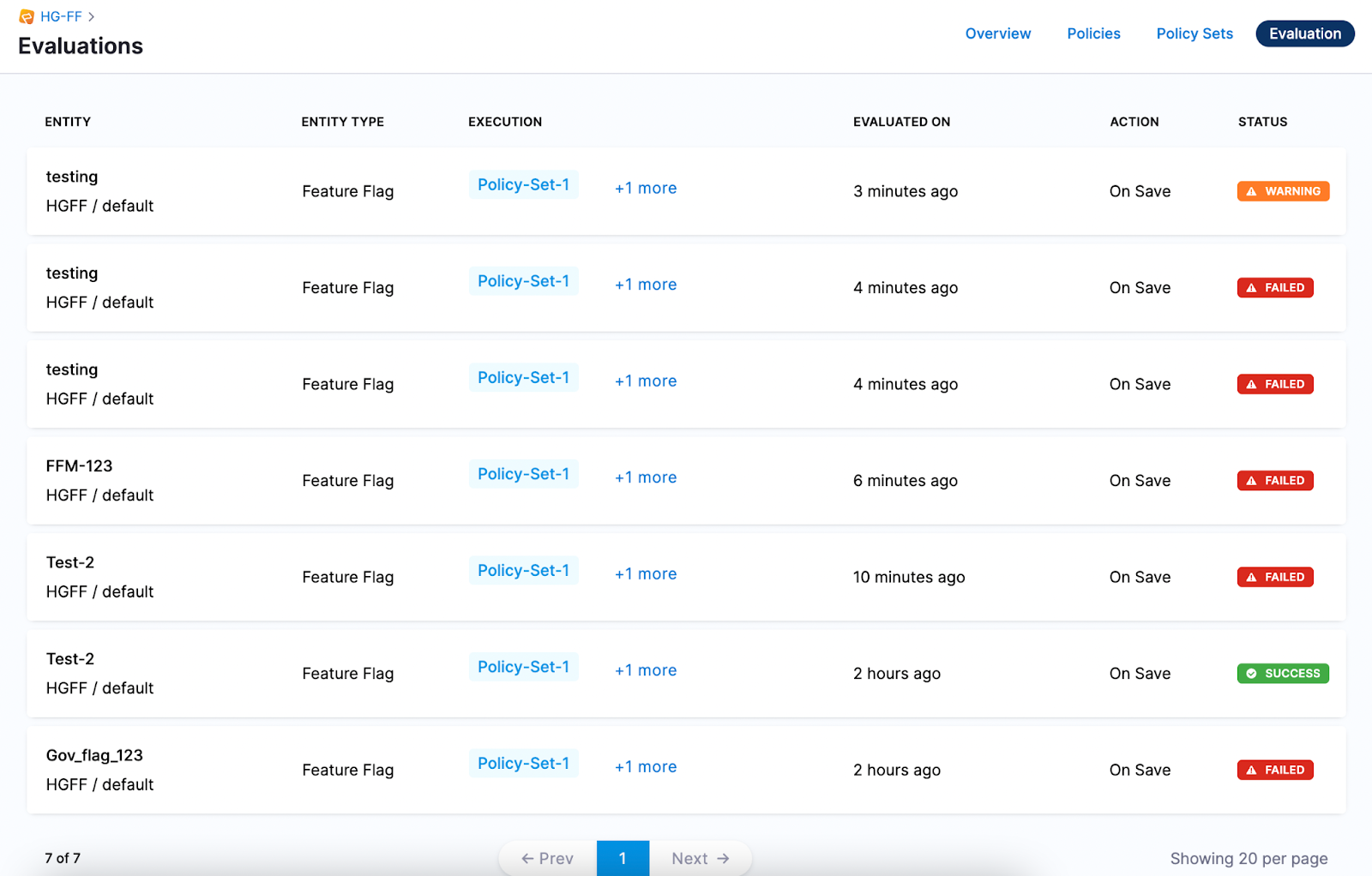 You can view all failures, warnings, and successes of evaluations for each of your Policy Sets.