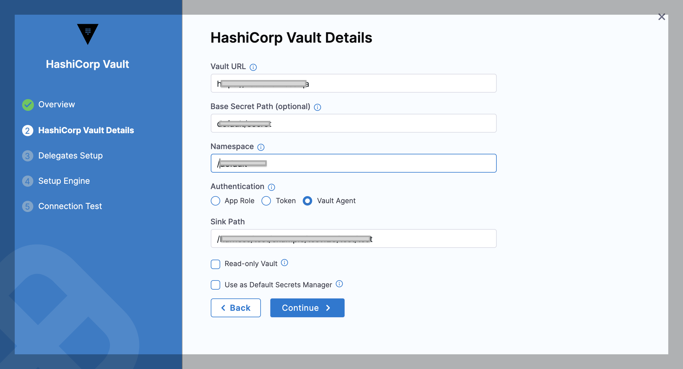 In the Sink Path field, enter any sink path you have in your Vault Agent Configuration. This is the path of the encrypted file with tokens. The specified delegate reads this file through file protocol (file://).