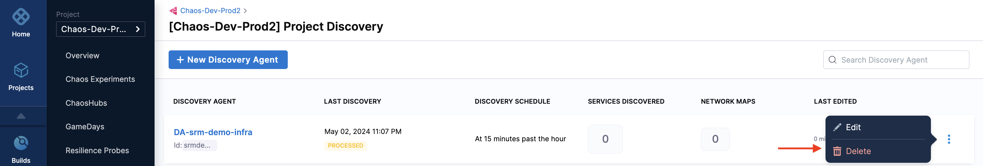 To delete a discovery agent, navigate to the agent you want to delete and select Delete.