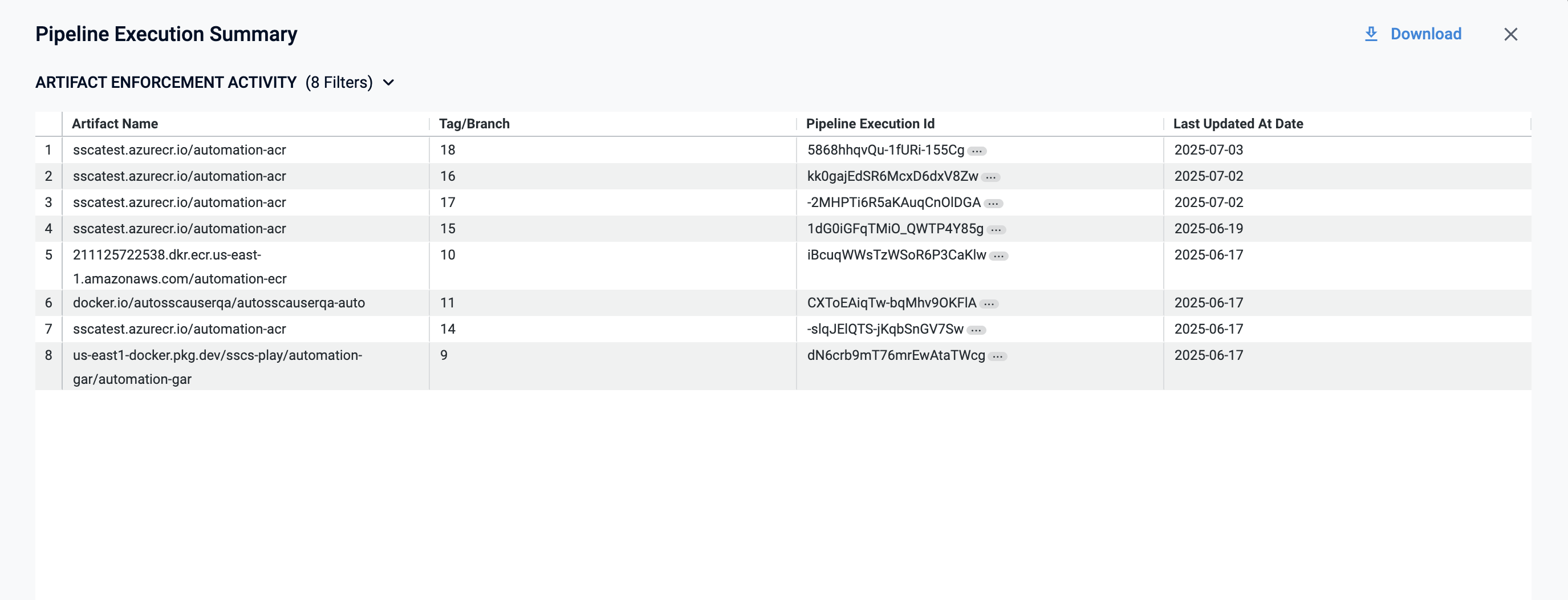 Executions With Violations: Number of pipeline executions that failed SBOM policy checks. When you Click on the violations count, this opens a pop-up table with the following columns: